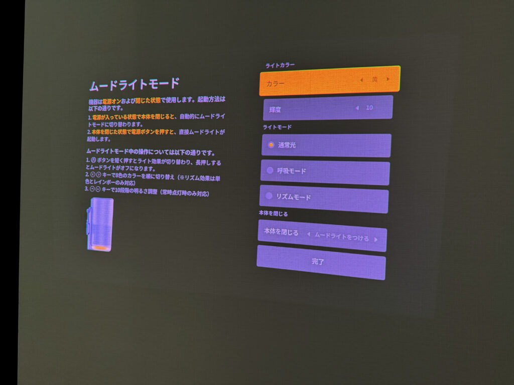 本体を閉じるとムードライトモードいう