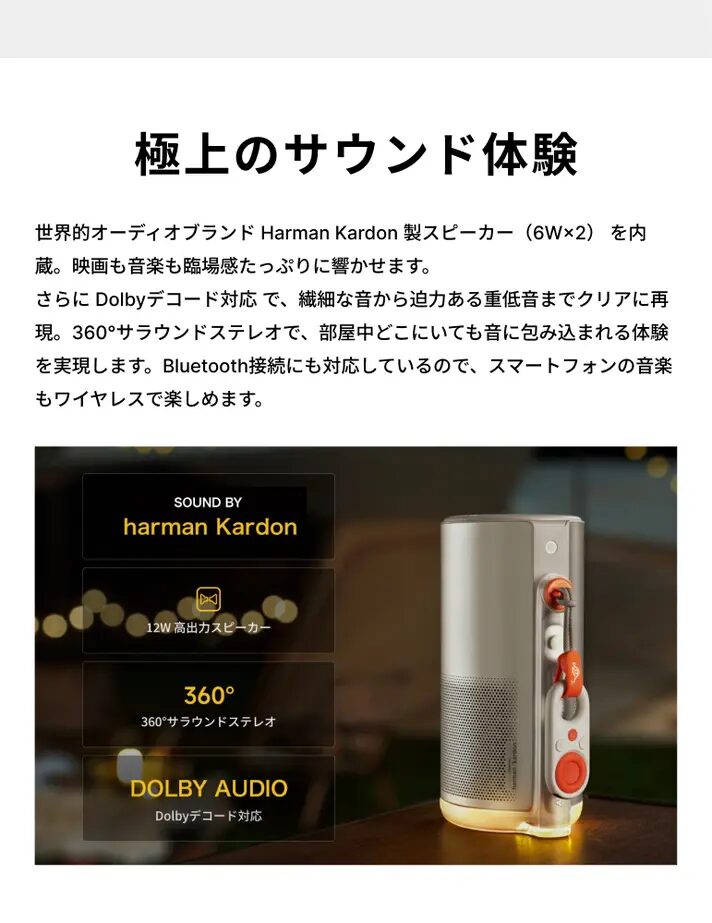 | 機能 | 360°スタンド、オートフォーカス、 自動台形補正、画面はリアルタイムで補正 |