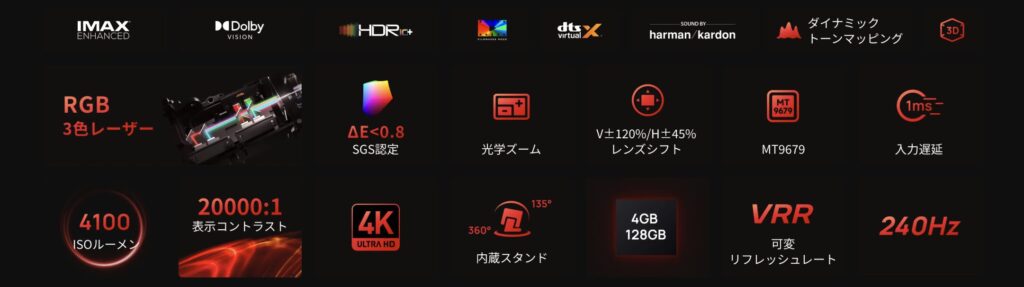 | ランプ寿命 | 20,000時間 (ゲームモード、VRRオン、AKオフ) 1080P@240Hzで1ミリ秒 1080P@120Hzで2.2ミリ秒 4K @60Hzで3ミリ秒 |